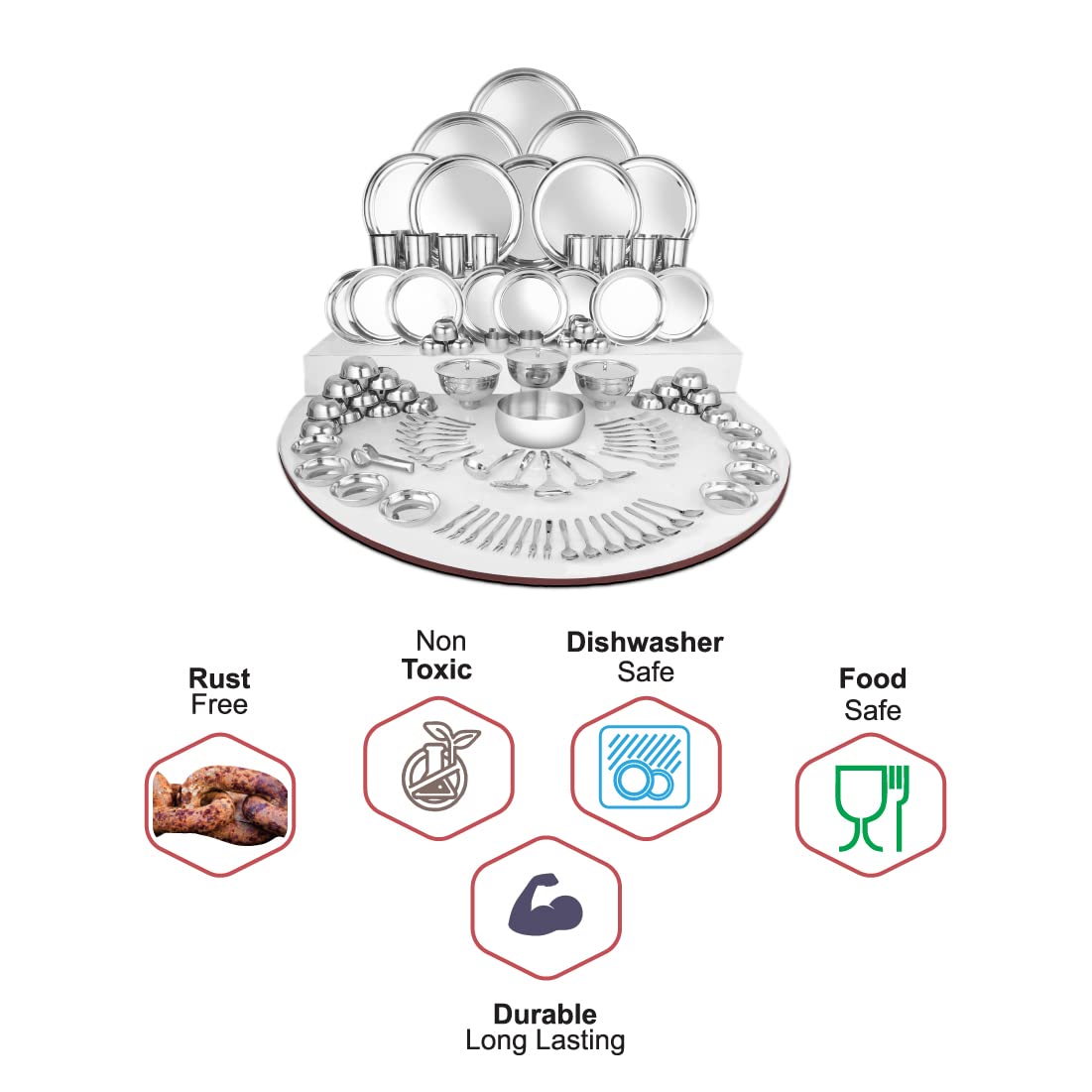 • Premium Quality Stainless Steel: Our dinner set is made from high-quality stainless steel, known for its corrosion resistance and longevity. You can trust that your investment will last for years to come, maintaining its shine and beauty.