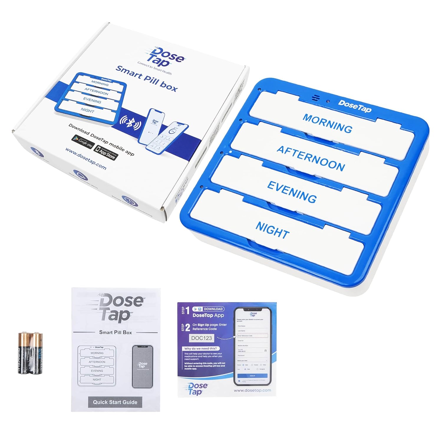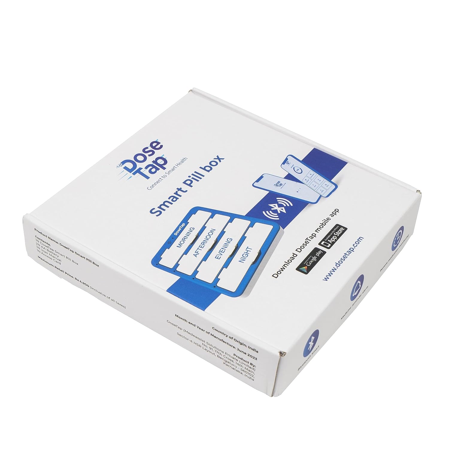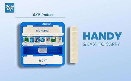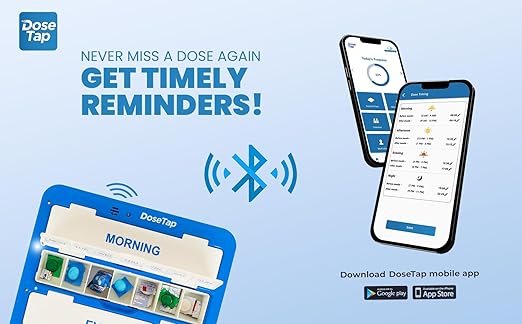 • Innovative Patented Design: The Dose Tap Smart Pill Box with Bluetooth Connectivity features light indicators and buzzer alerts to ensure timely medication intake, setting a new standard in medication management and medication reminder systems.