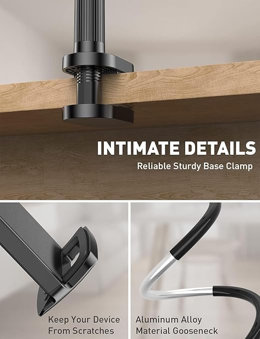 【Heavy Duty & Sturdy Holder】: The large base ensures stable mounting without vibrations. The tight and bendy arm securely holds your smartphone, iPad, tablet, or other electronic devices, preventing them from falling or moving around.