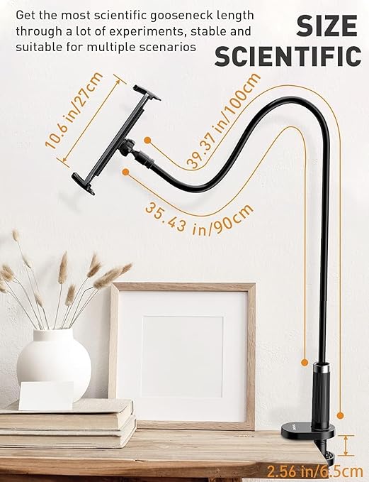 【Compatibility】: This ergonomic gooseneck tablet holder is compatible with a wide range of 4 to 10.5-inch cell phones and tablets, including iPad mini series, iPad Pro, iPad, Galaxy Tab, and Switch. Accommodates various devices for versatile use.