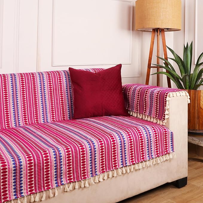 STITCHNEST Woven 1 Seater Sofa Protector with 2 Hand Rest Covers – Purple & White Stripe Design – Washable Fabric with Tassels – Stylish Sofa Cover for Modern Living Room & Furniture Décor