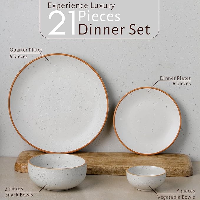 The Earth Store Handcrafted White Matte Brown Ceramic Dinner Set, 21 Pieces Serving for 6, Microwave and Dishwasher Safe, Bone-Ash Free, Dinner Sets | Crockery Set for Gifting & Dining
