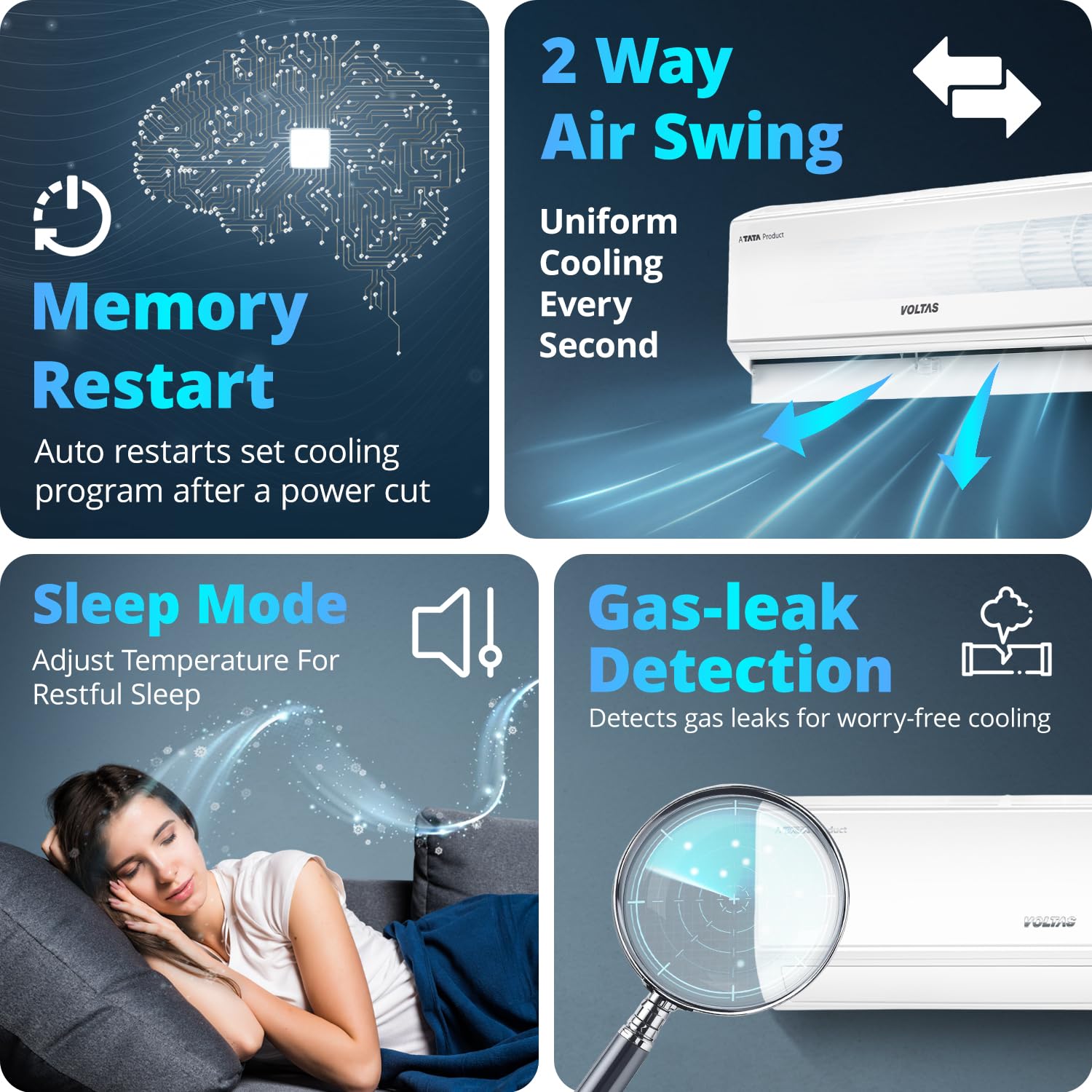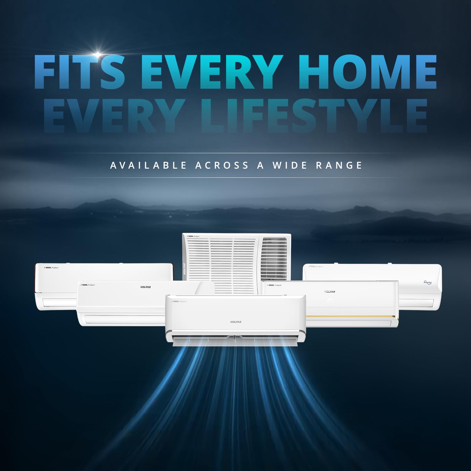 • Split AC with inverter compressor: Variable speed compressor which adjusts power depending on heat load. Convertible / adjustable with 4 cooling modes through remote control to operate in different tonnages for different cooling needs