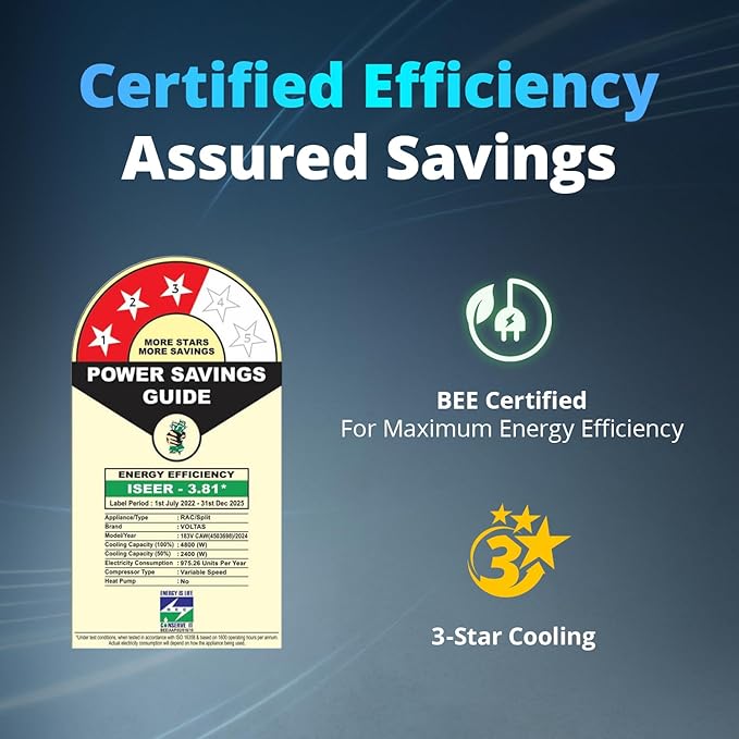 • Energy Rating: 3 Star Energy Efficient. Annual Energy Consumption: 975.26 kWh/year. Maximum cooling capacity: 4800W; ISEER Value: 3.81. BEE Label Validity Period: 1st July 2022 - 31st Dec 2025.