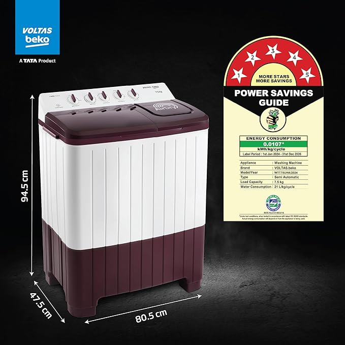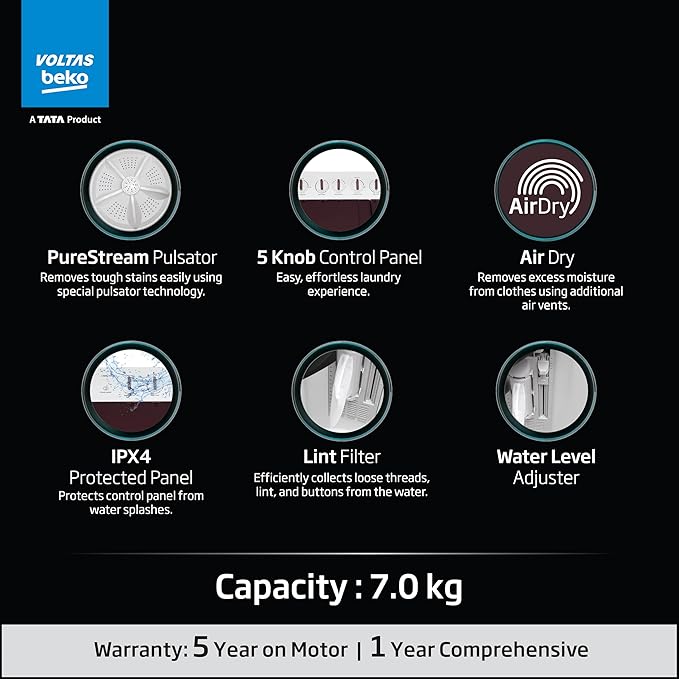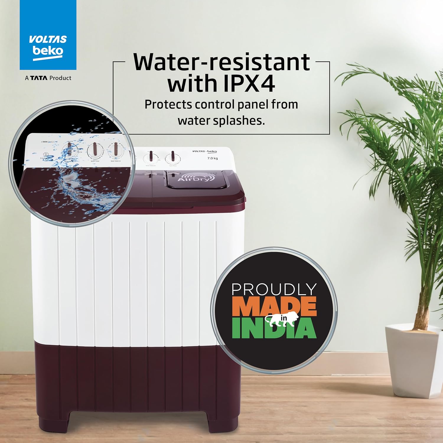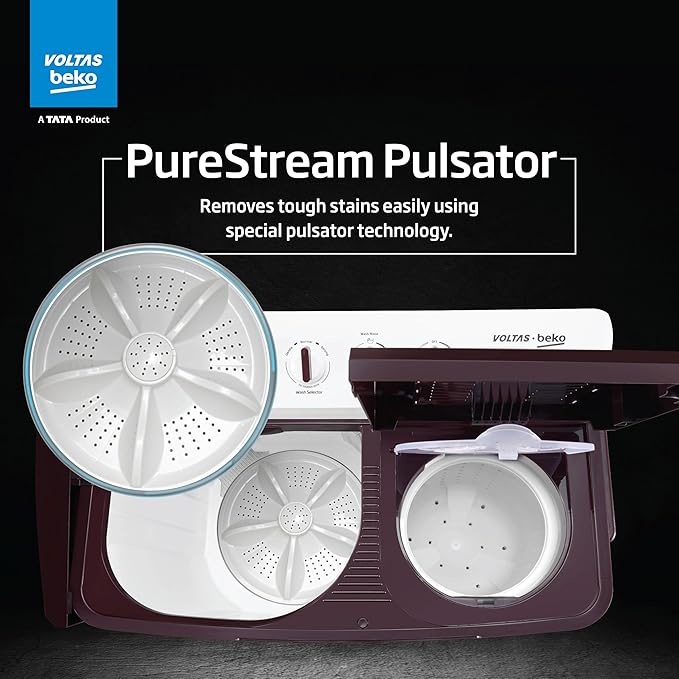 Voltas Beko, A Tata Product 7 Kg 5 Star Semi-automatic Top Load Washing Machine with PureStream Pulsator Wash Technology (WTT70UHA/OK5R0R0W01, Burgundy, 5 Knob Control Method)
