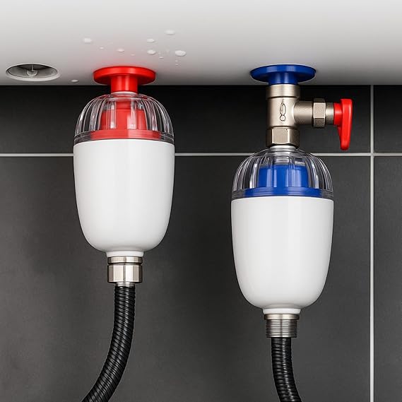 Water Heater Filter with Anti-Electric Shock Safety Valve | Geyser Leakage Protection with Reusable Sediment Filter Strong Dirt & Scale Remover | Universal 1/2" Inlet (Combo - Red & Blue)