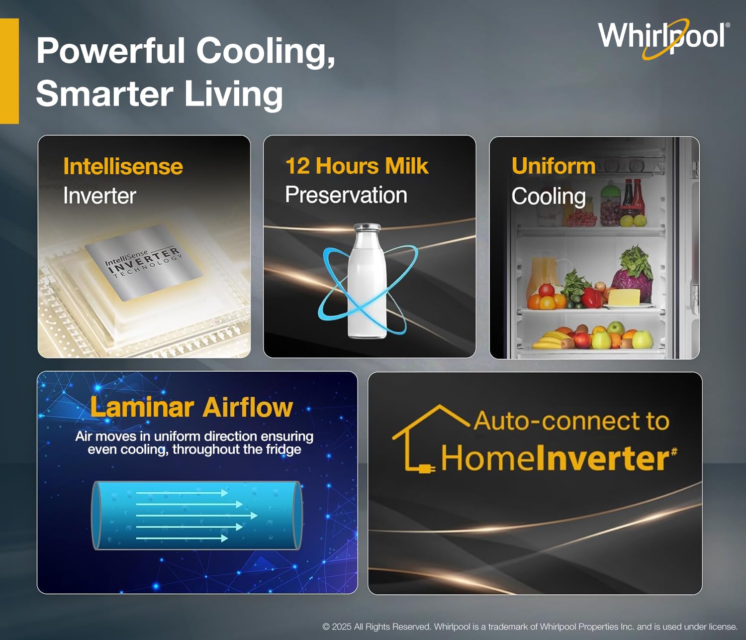 • Brand Specific Features -12 Hours of cooling retention, Jumbo Bottle Storage, Insulated Capillary Technology, Auto Connect To Home Inverter, Large Vegetable Crisper, Honey Comb Lock In Technology, Easy Manual Defrosting & Large Freezer Capacity