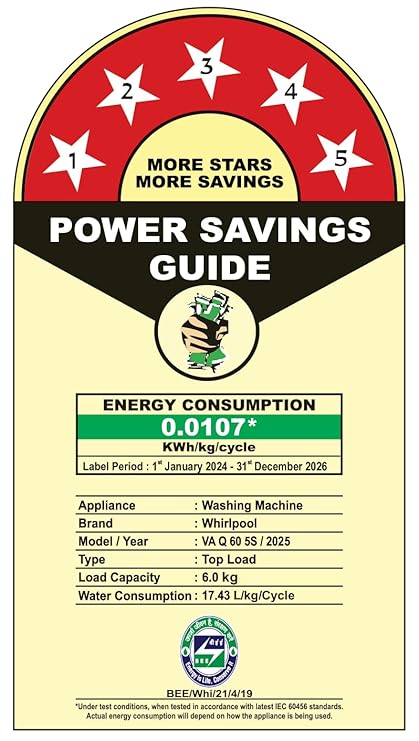 Energy star rating 5 Star: Best in class efficiency, Annual Energy Consumption : 0.0107 KWh/Kg/cycle (Please refer BEE label for more information), Model/Year : VA Q 60 5S/2024