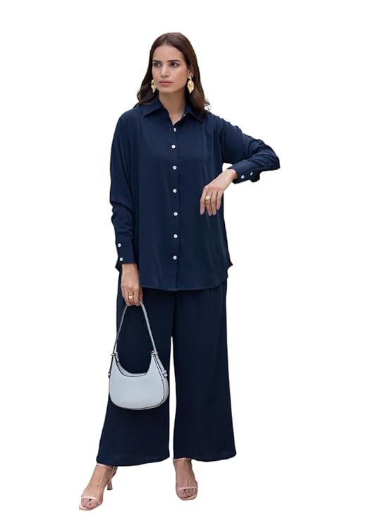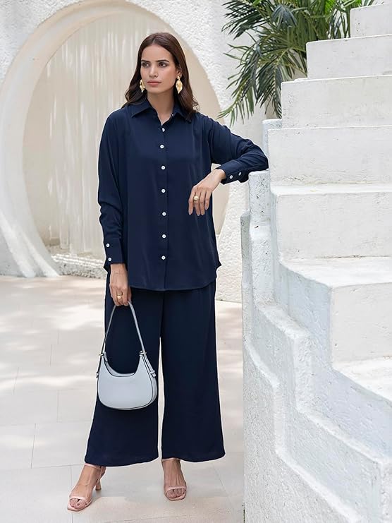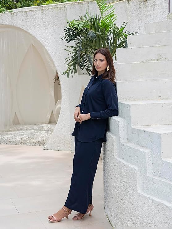 Women's Polyester Shirt And Trouser Navy Blue Color Co-Ord Set