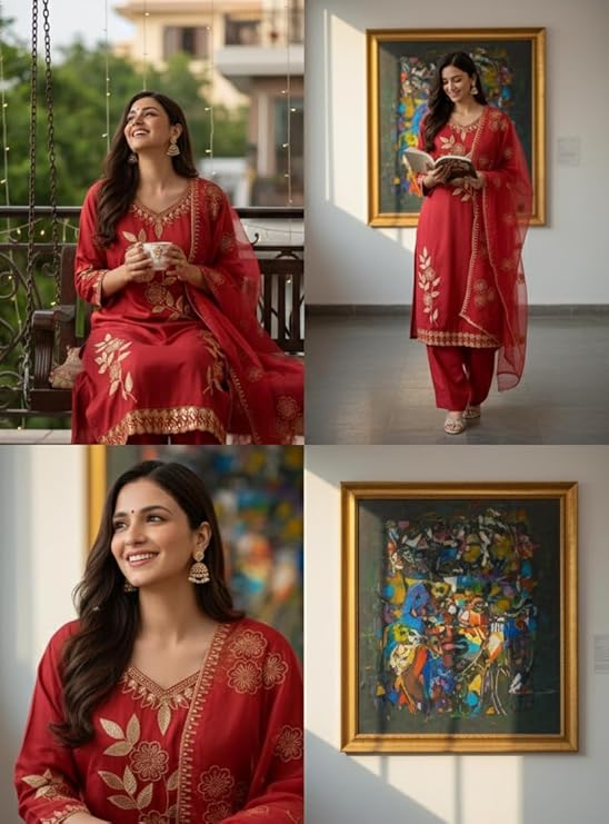 • ELEGANT FLORAL EMBROIDERY: Rich red kurta set featuring detailed floral embroidery inspired by traditional Indian craftsmanship, suitable for special occasions and celebrations