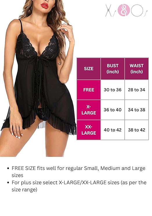 Size : Free Size women lingerie fits well for regular SMALL, MEDIUM and LARGE sizes. Size Range FREE SIZE: Bust (30 to 36 inch), Waist (28 to 34 inch). For plus size select : X-LARGE : Bust (36 to 40 inch), Waist (34 to 38 inch), XX-LARGE : Bust (38 to 42 inch), Waist (36 to 40 inch)