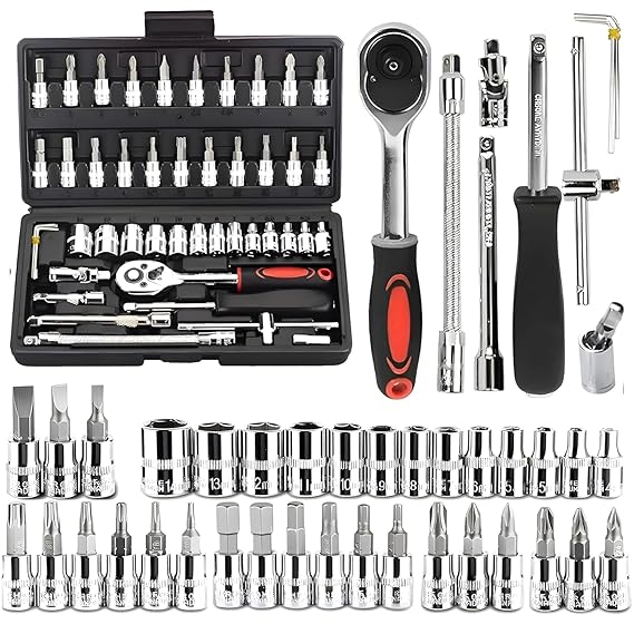 What’s in the box: 46-Piece Tool Set Includes: 13pcs 1/4@ drive sockets (4-14mm), 21pcs drive bit sockets (PH/PZ/FD/HW/T sizes), U-Joint, Flexible Extension Bar, Spinner Handle, 2-inch and 4-inch Extension Rods, Sliding T-Bar, 72T Ratchet Handle, 3pcs Hex Key Wrenches (1.25-2.5mm), Slotted Bits (4mm, 5.5mm, 7mm), 2pcs 1/4@ drive extension bars, 1pc quick ratchet, 1pc universal joint, 1pc sliding bar, 1pc soft flexible extension, all stored in a durable blow case for easy storage and portability.