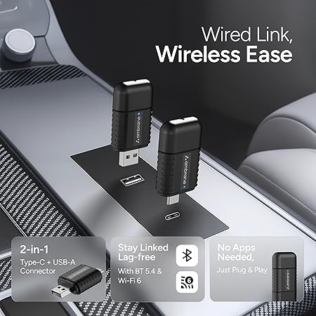Ambrane 2 in 1 Wireless Car Play Android Auto Adapter | Convert Wired to Wire-Less Car Play/Android-Auto | Plug Play USB Dongle | Bluetooth 5.4 + Dual-Band Wi-Fi | Works with iPhone Smartphone