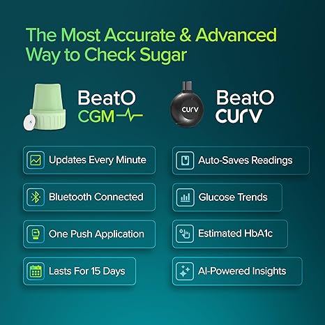 BeatO Combo: CURV Glucometer Machine (Android Type-C) + 15-Day CGM Continuous Glucose Monitor | Smart Sugar Test Machine for Home | Real-Time Blood Sugar Monitoring Device with Strips | Best Glucometer for Accurate Results