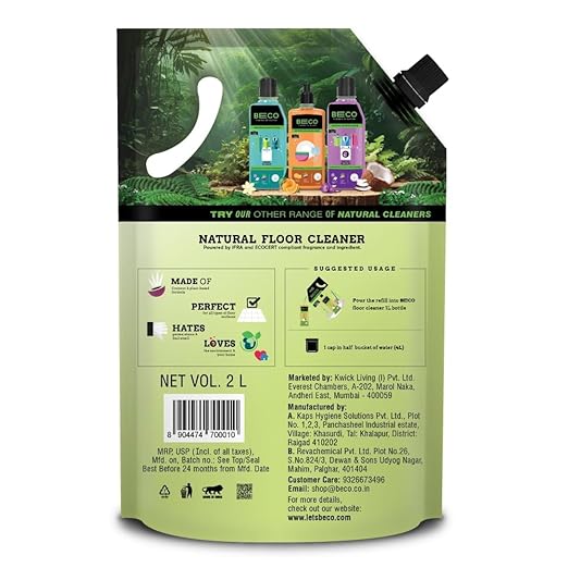 Beco Natural Disinfectant Surface Floor Cleaning Liquid | 2L Refill Pack | Non Toxic Germ Kill Formula | Lemongrass Basil Freshness |Safer than Phenyl| Kids Safe, Pet Friendly Floor Cleaner Liquid