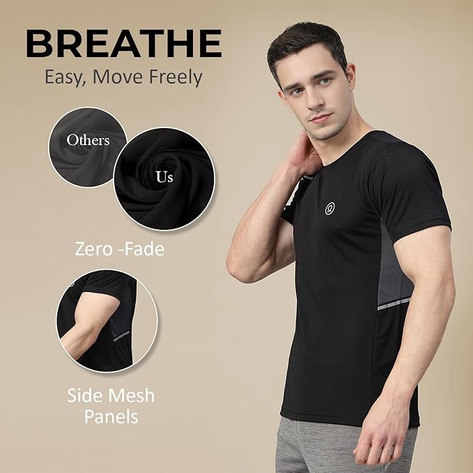 CHKOKKO Men Polyester Solid Quick Dry Sports Gym T-Shirt Breathable Moisture-Wicking Half Sleeve Round Crew Neck Regular Fit Active Wear for Running and Training