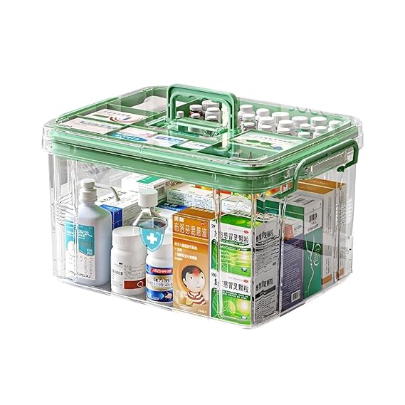Clear Plastic Medicine Storage Box Organizer, Family Emergency Kit with Removable Pill Case Portable Lockable Container for, Art Craft and Cosmetic Household Organizer (Green, Small)
