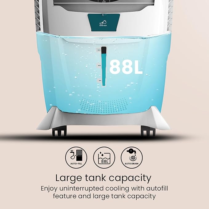 • Auto Fill & High Tank Capacity: The air cooler comes with 88L tank capacity which allows you to experience cool air for a long time while the auto fill allows continuous water supply.