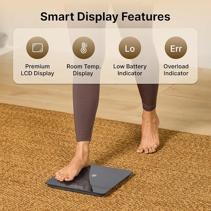 • STYLISH, USER-FRIENDLY DESIGN: Featuring a sleek, modern design, this scale includes a large, easy-to-read LCD display with automatic On/Off functionality and low battery indicators.