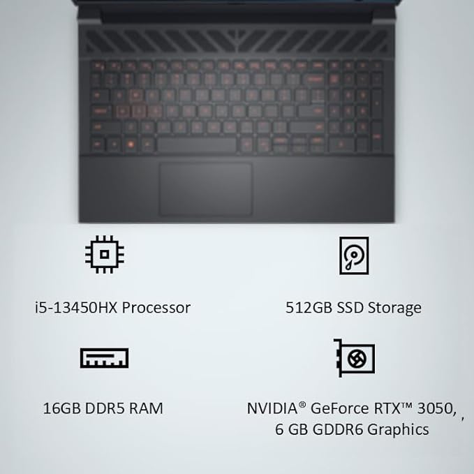 Dell G15-5530, 13th Gen Intel Core i5-13450HX, RTX 3050-6GB, 16GB DDR5, 512GB SSD, FHD, 15.6/39.62cm, 120Hz, Windows 11, MS Office 21, Dark Shadow Grey, 2.65KG, Backlit KB 4-Zone RGB Gaming Laptop