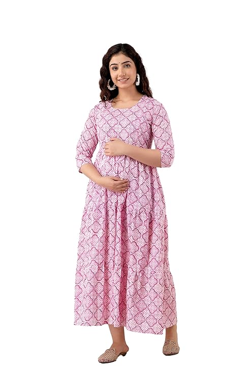 Devek Rayon Midi Maternity Dress Feeding Dress Pregnancy Dress A Line Western Dress with Zippers