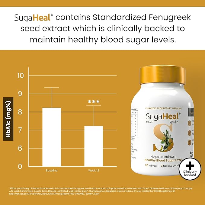 • HELPS MAINTAIN HEALTHY HbA1c LEVELS - SugaHeal has proven to maintain healthy Glycated Haemoglobin levels. Glycated Haemoglobin is the measure of amount of free unused glucose in the body, if the levels are maintained in the healthy range for Diabetics, the chances of complications arising due to diabetes will be reduced significantly.
