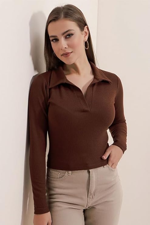 Dream Beauty Fashion Women Collared Neck Long Sleeve Slim Fit Casual Tee Top, quot; inches (Apple-01-P)