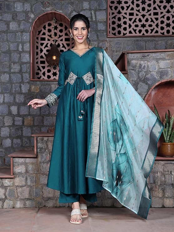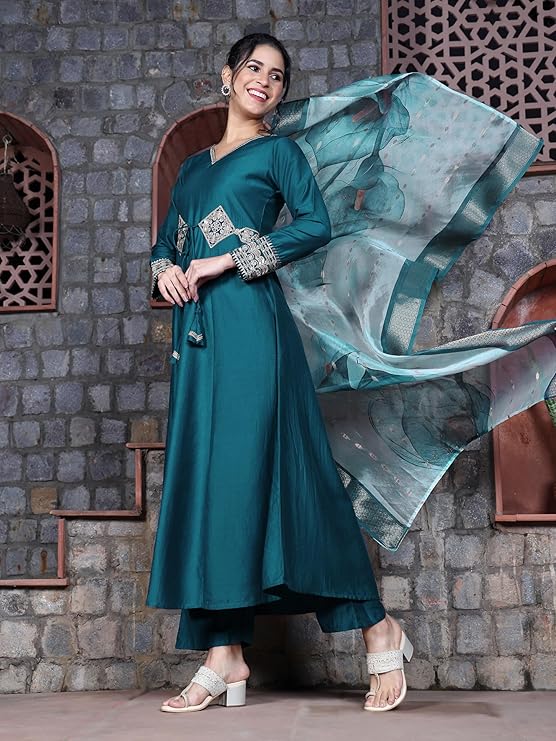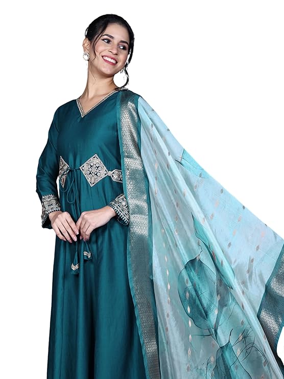 • Kurta details | Color : Teal | Fabric : Cotton Silk | Pattern : Patch Work & Embroidered | Type : Anarkali | Length : Ankle length