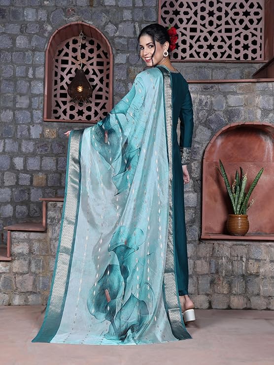 • Dupatta Details : | Fabric : Cotton Silk | Color : Teal | Pattern : Digital Print | Length : 2.25 Meter
