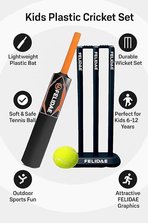 FELIDAE (Size – 3) Cricket Bat Set for Boys Age 6-10 | Size 3 Plastic Bat with Ball Wicket Set | Outdoor Cricket Kit for Children | Lightweight Bat and Ball for Garden, Beach, Backyard Play