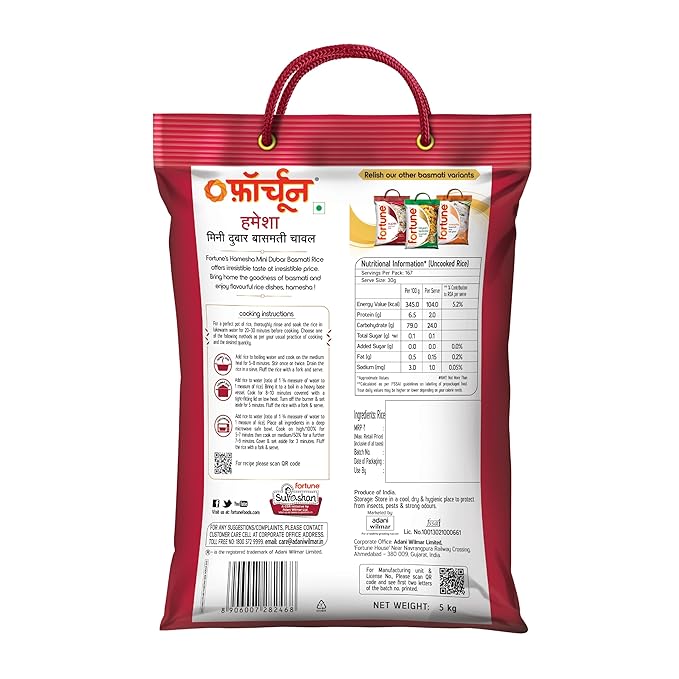 PERFECT FOR DAILY COOKING: Fortune Hamesha Mini Dubar Basmati Rice 5kg is ideal for everyday meals like dal-chawal, kadi-chawal, khichdi, and pulao – great taste and quality in every serving