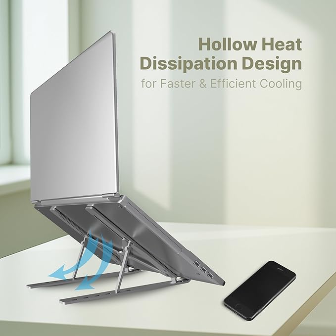 • Hollow Ventilation Design for Heat Control: The open-frame base improves airflow beneath your laptop, preventing overheating. Compared to solid stands, this design ensures your device stays cooler — especially useful for gaming or high-performance laptops.