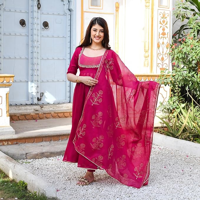 GoSriKi Women's Rayon Viscose Embroidered Anarkali Kurta with Pant & Dupatta