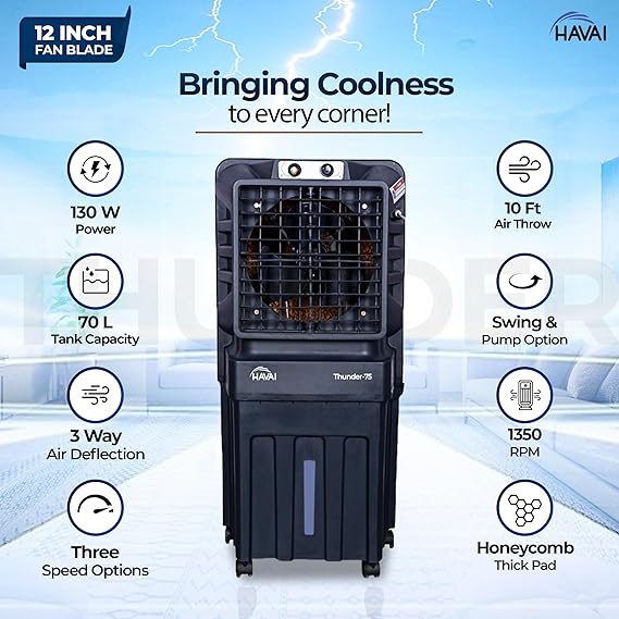 HAVAI Thunder-75 Tower Air Cooler | 70L Tank | 12″ Blade | Ideal for 150 sq ft Rooms | 130W Power | 10 ft Air Throw | 1350 RPM | Auto-Louver | 3-Speed | 1-Year On-Site Motor Warranty (Black)