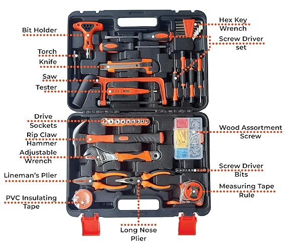 INCLUDES : Comprehensive assortment of professional-grade wrenches, ratchets, a complete range of metric-sized sockets and precision screwdriver, hammer, measuring tape, pliers, wrench. etc. The ratchet easily changes direction by flick of 5-degree switch. Variety of screwdriver bits : Phillips, slotted, square, star and pozidriv. Also includes soft-grip handle on screwdriver, plier, wire stripper and hammer provides excellent comfort and control