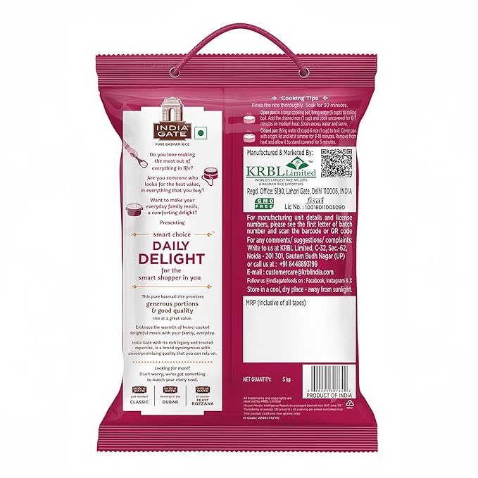 Hygiene and Purity Assured: India Gate Daily delight Pure Basmati Rice is an easy-to-cook rice packed in the industry's best, state-of-the-art facilities. It is 100% untouched by hand and comes with air-tight packaging with zero contamination