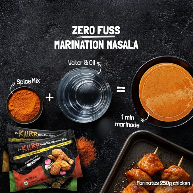 • KILLER TASTE, ZERO FUSS Just add water and ghee, your chicken marinade is ready in 1 minute, that’s it! Marinate for 30–45 mins and cook. KILRR Chicken Masala works great for chicken tikka, tandoori chicken and chicken fry.