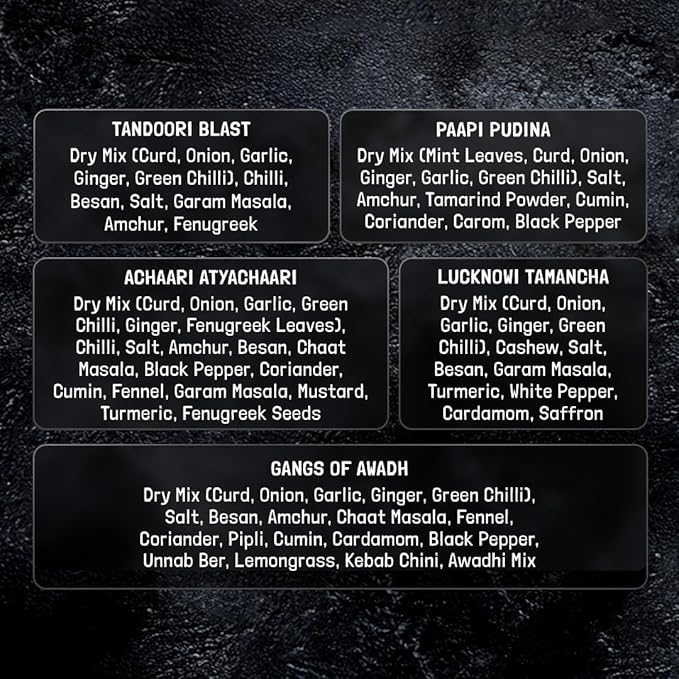 • EACH PACK CONTAINS 2x Tandoori Blast, 1x Saza-E-KaaliMirch, 1x Pistol Pesto, 1x Achaari Atyachaari, 1x Gangs of Awadh, 1x Dhaniya Mirchi Aur Woh, 1x Afghan-Ka-Shaitaan, 1x Lucknowi Tamancha, 1x Paapi Pudina. Quantity: 220gm