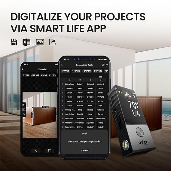 Digitalize Projects via Dedicated APP: The paired @SMART LIFE@ App allows you to directly drag and drop the measured data on hand-drawn plans or uploaded on-site pictures, which streamlines and simplifies your workflow. You can export the data for use with a program on PC terminal, send the original plan to clients, or create a excel spreadsheet to store the measurements for your follow-up projects