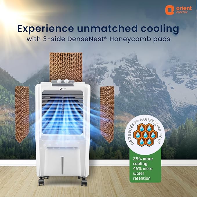 • 3-side Densenest Honeycomb cooling pads: With unique Densenest Honeycomb pads that retain 45% more water, our air cooler gives 25% extra cooling, keeping you comfortable even during peak Summers.