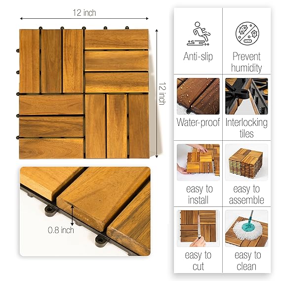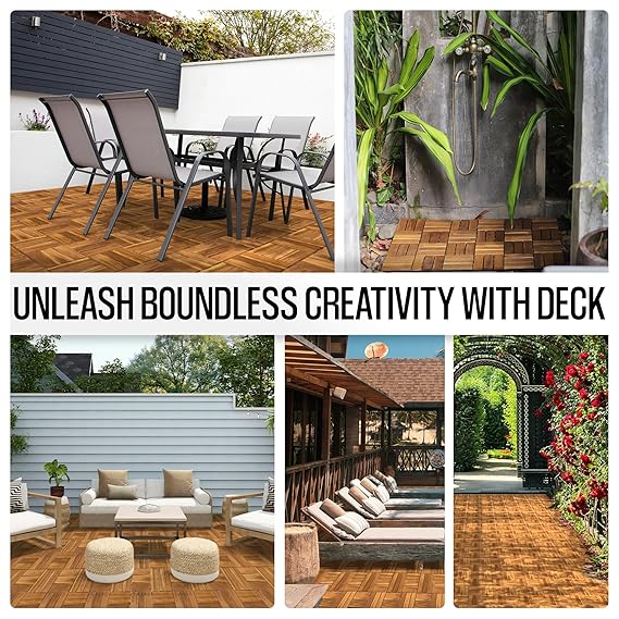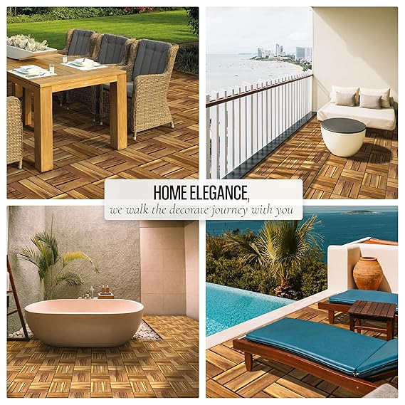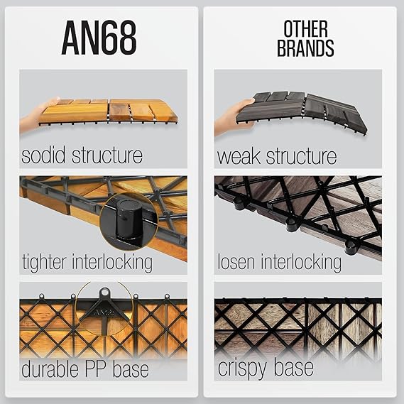 PREMIUM NATURAL ACACIA WOOD: AN68 interlocking deck tiles are made from 100% natural acacia wood and PPC base, these decking tiles are engineered to withstand outdoor environments. Their smooth surface and elegant design add a refined touch to any space, while their sturdy construction ensures reliable performance.
