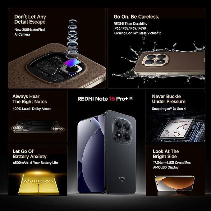 REDMI Note 15 Pro+ 5G (Carbon Black, 8GB+256GB) | 200MasterPixel OIS Camera | Snapdragon 7s Gen 4 | 17.3cm CrystalRes AMOLED Screen | IP66/68/69/69K | Mega 6500mAh Si/C Battery | 100W Hyper Charging
