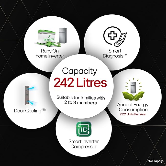 • Capacity 242 litres: Suitable for families with 2 to 3 members I freezer capacity: 62 L; fresh food capacity (Fridge): 180 L