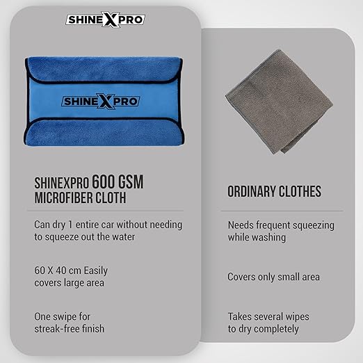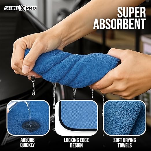 ULTRA-ABSORBENT 600 GSM FABRIC: ShineXPro Microfiber Cleaning Cloth is made with premium AA-grade microfiber ensures maximum water absorption. The ultra-dense fiber structure allows it to hold up to several times its weight in water.