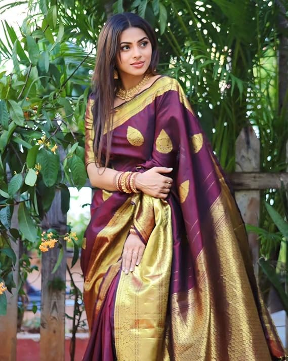 Silk Saree with Golden Border, Maroon and Gold, Traditional Indian Ethnic Wear