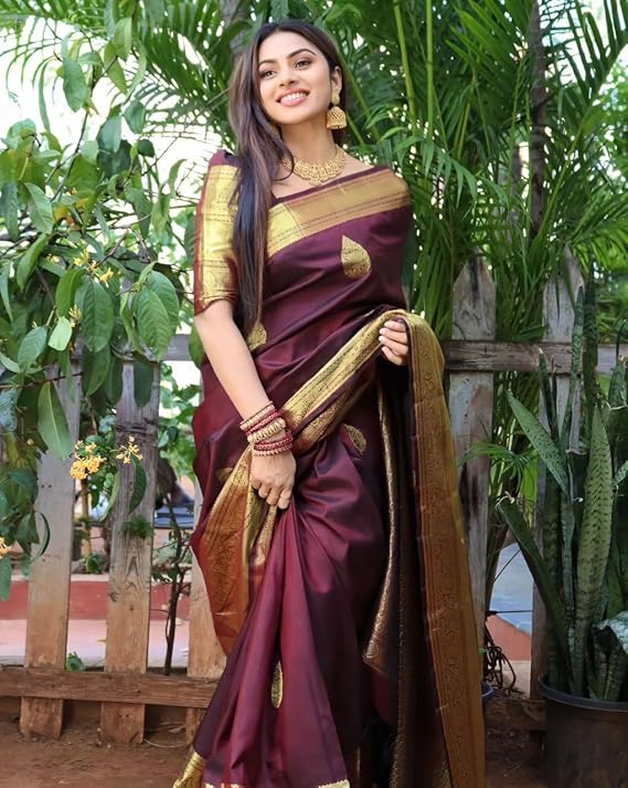 • Elegant Colour Combination: Features a rich maroon body beautifully complemented by a striking golden border, creating a timeless and sophisticated ethnic look