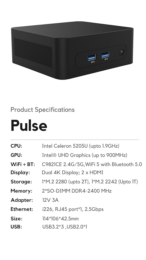 SKULLSAINTS Pulse Mini PC – Celeron 5205U, Dual M.2 SSD Slots, 2.5Gbps LAN, HDMI Dual 4K Display, WiFi 5, BT 5.0 (4GB DDR4 + 128GB M.2)