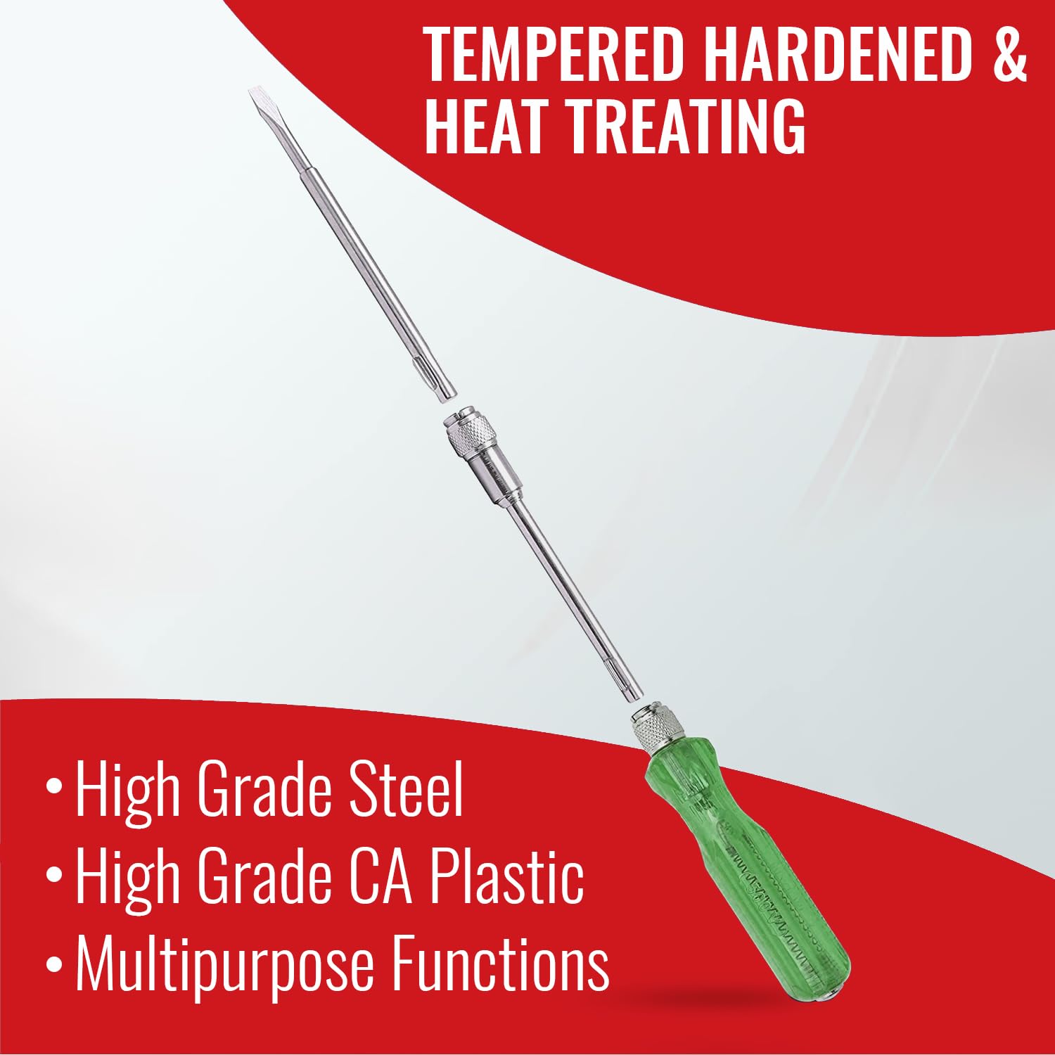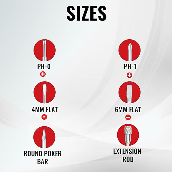 ERGONOMIC DESIGN: A round poker bar with a transparent PVC handle that provides a comfortable hold and maximum control at work. Interchangeable design allows quick switching of flat blades and Phillips heads