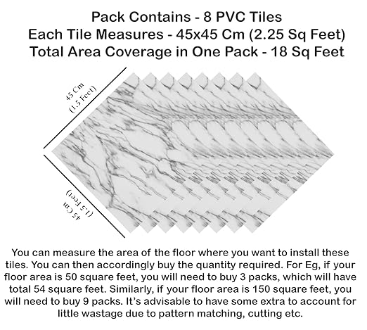 You can measure the area of the floor where you want to install these planks. You can then accordingly buy the quantity required. For Eg, if your floor area is 50 square feet, you will need to buy 3 packs, which will have total 54 square feet. Similarly, if your floor area is 150 square feet, you will need to buy 9 packs. It’s advisable to have some extra to account for little wastage due to pattern matching, cutting etc.