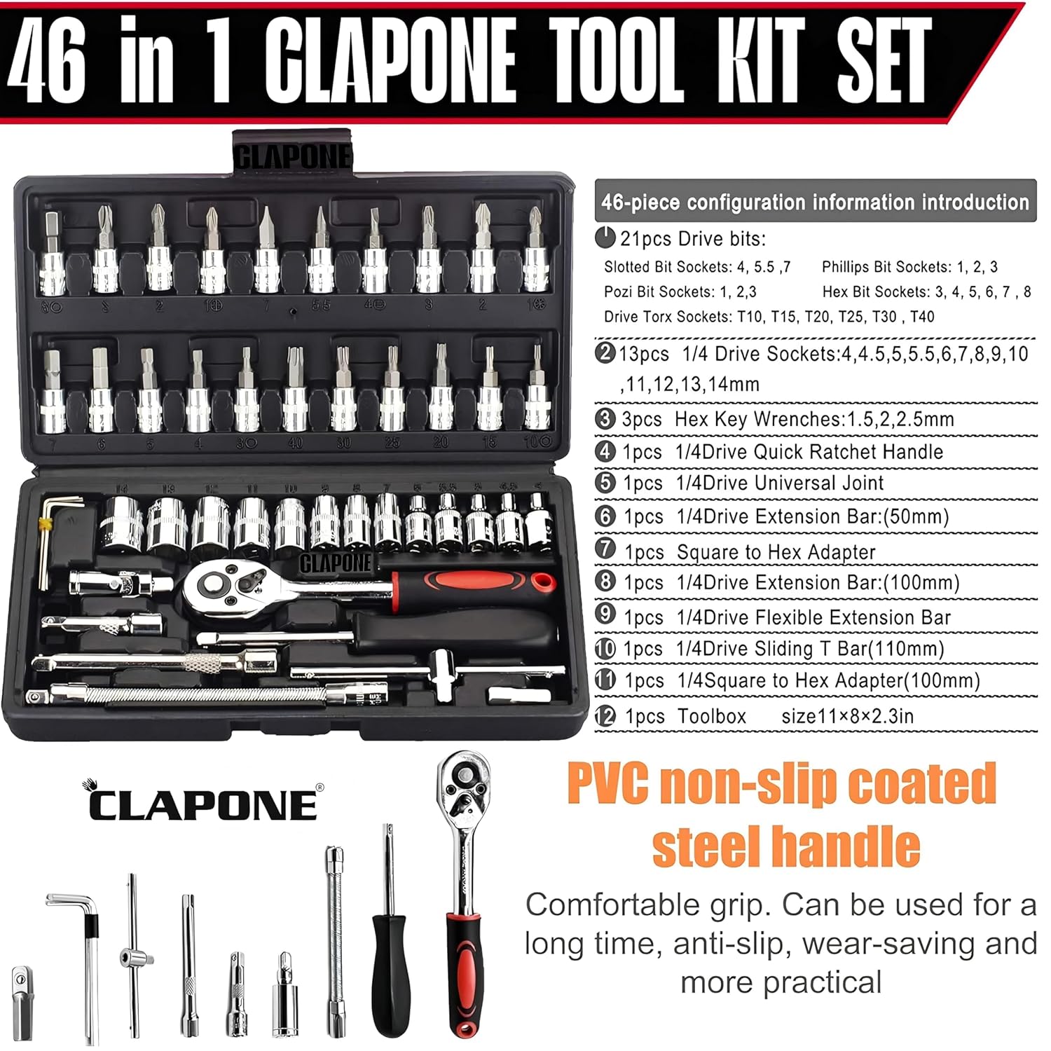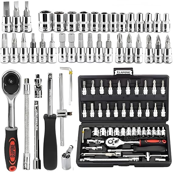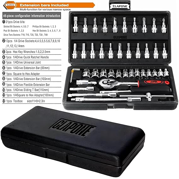 This complete 46 piece combination offers a practical selection of sockets, a smooth ratchet wrench and a multi purpose screwdriver, allowing flexibility across many repair tasks. The CLAPONE tool kit brings together essential components in one place, reducing the need for multiple tools and helping users efficiently manage fastening jobs during auto repairs or routine maintenance.